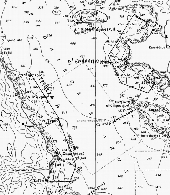 Α: Βόρειο άκρο στην περιοχή του ακρωτηρίου του όρμου Κρυονέρι Τυρού πρίν την ιχθυοκαλλιέργεια (N37°19.432‘ – E22°49.612‘ στην ευθεία με N37°19.510‘ – E22°49.760‘) (προσοχή διορθώσεις με κόκκινο!).
